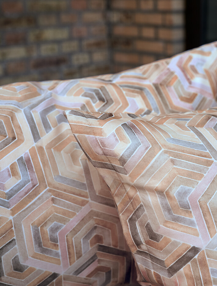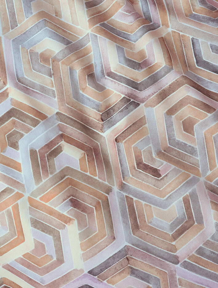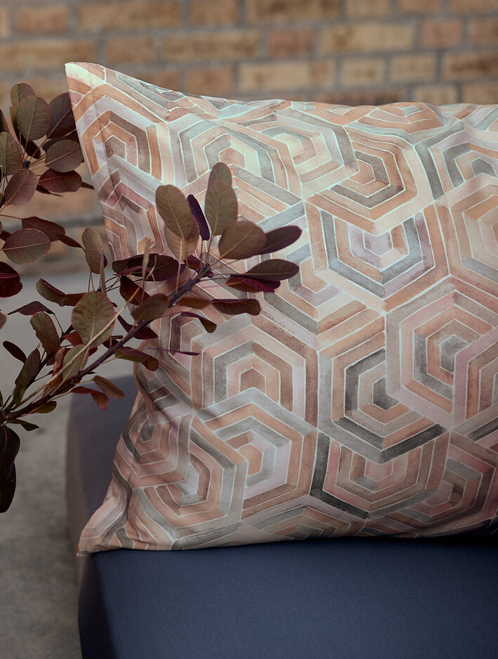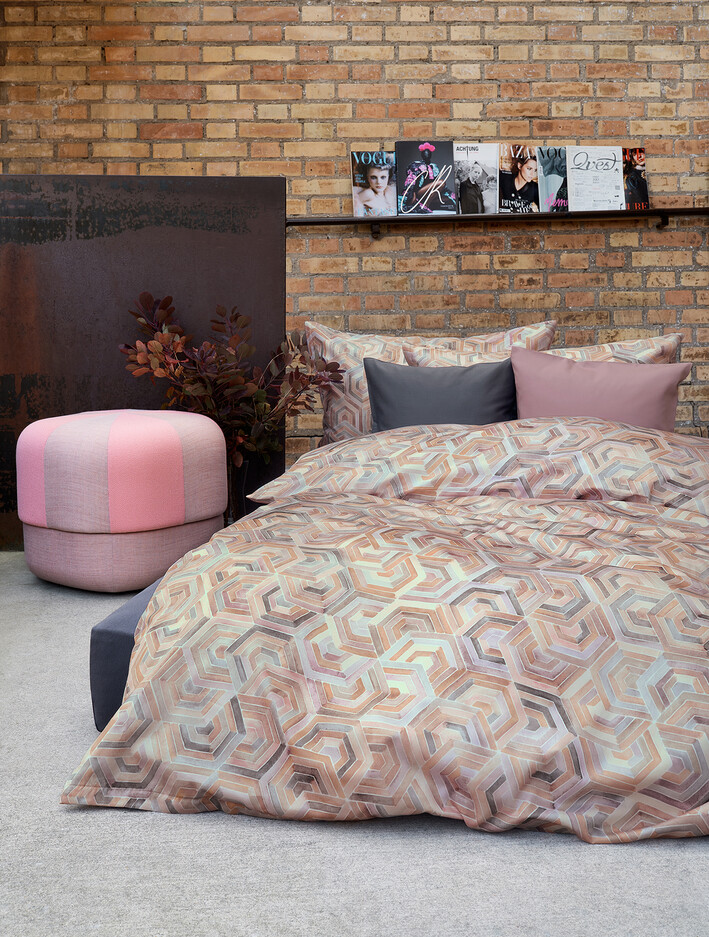 Sanft ineinander übergehende Sechsecke in Rosétönen, Braun und Anthrazit verleihen dem Dessin eine moderne, zugleich weiche Ausstrahlung. Der feine Satin bringt die filigrane Struktur zum Leuchten und sorgt für eleganten Glanz. Vielseitig kombinierbar, fügt es sich harmonisch in jeden Wohnstil ein.Pflegehinweise